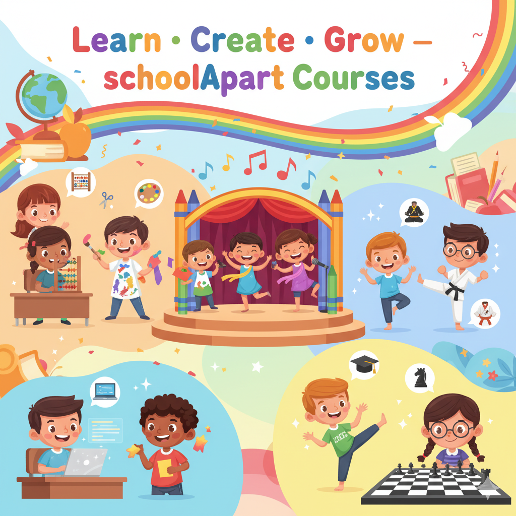 At schoolApart, we believe in nurturing every child’s talent – not just through books, but through creativity, confidence, and real-life skills. 🌟 Our diverse range of courses helps students learn smarter, express better, and grow stronger – both mentally and physically.